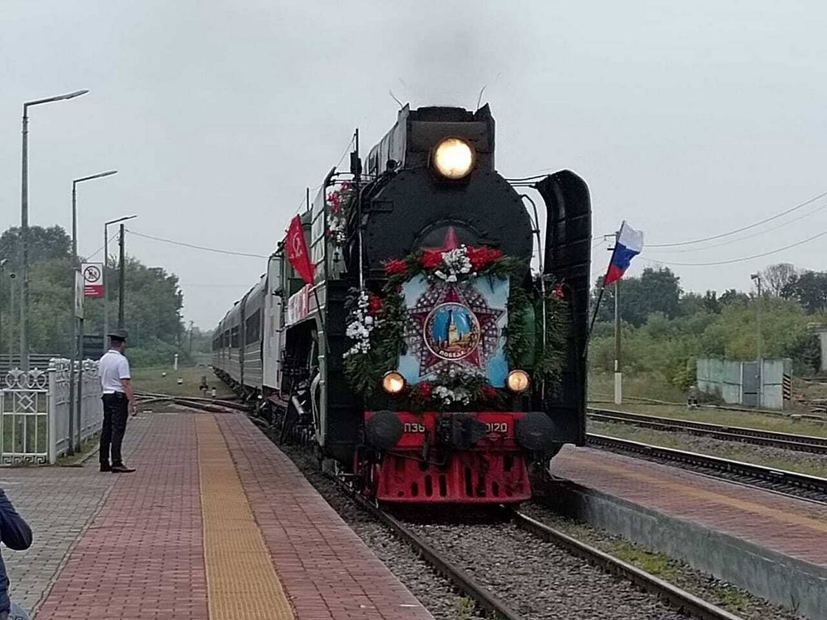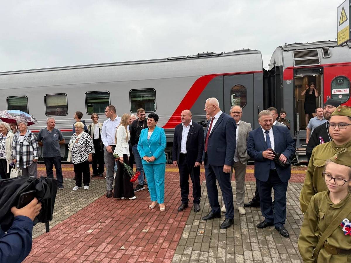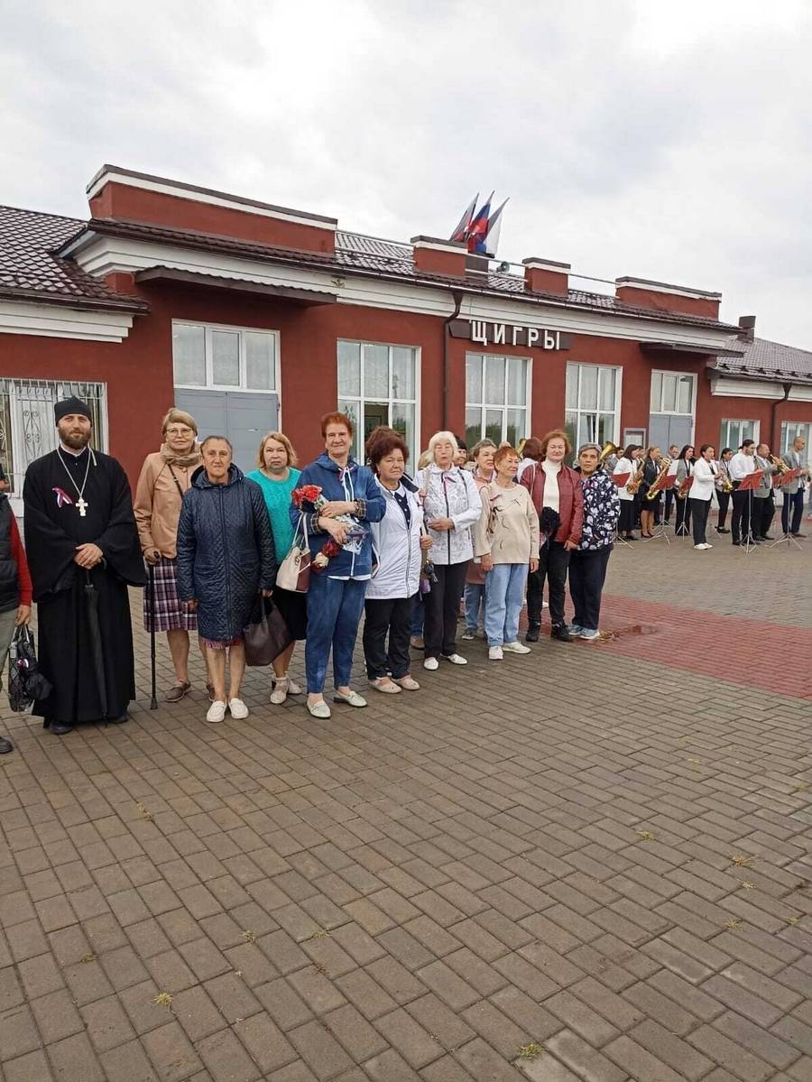 В рамках праздничных мероприятий, посвященных 82-й годовщине победы в Курской битве, на железнодорожном вокзале в Щиграх горожане с оркестром встретили прибывший в наш город легендарный состав - «Поезд Мира и Победы».