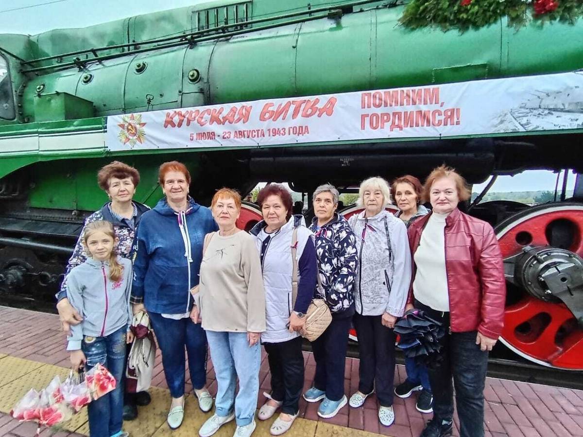 На перроне, несмотря на дождь, было оживленно и многолюдно. Вместе с детьми и молодежью отдать дань памяти подвигу народа пришли люди старшего поколения - участники проекта "Курское долголетие".