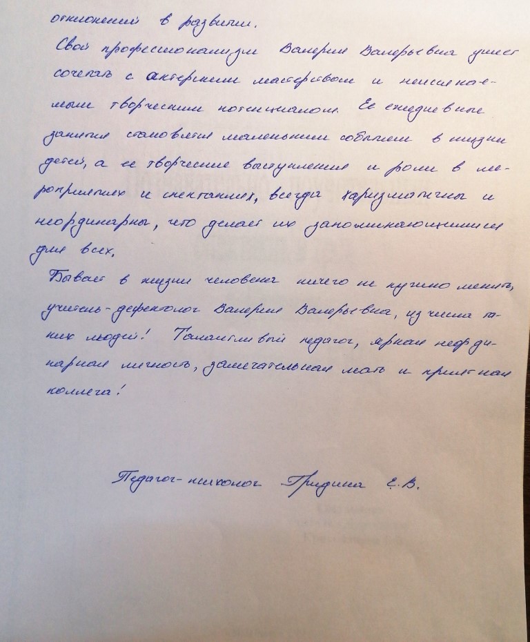 Валерия Валерьевна Криволапова - прекрасный специалист и грамотный педагог, она ведет активную общественную жизнь, отличается надежностью, ответственностью, обязательностью и честностью по отношению к воспитанникам и коллегам.